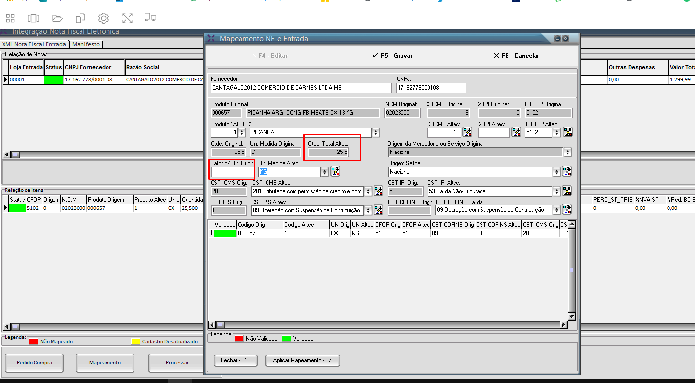 Verificado que a QTDE ORIGINTAL já é a quantidade total em KG, e o FATOR P/UN.ORIG. que o cliente está colocando é 12,25kg que equivale a uma caixa