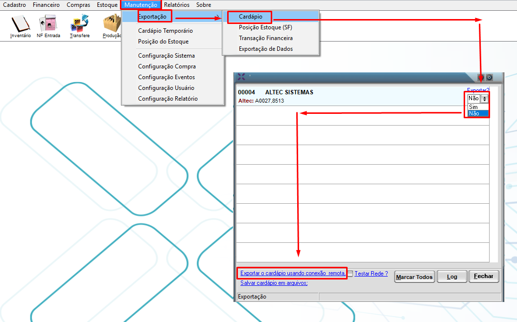 manutenção> Exportação> Cardápio> Exportar? : Sim> Exportar usando Conexão Remota.